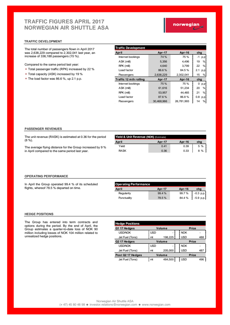 Norwegian Air Shuttle ASA - estadísticas de tráfico de abril de 2017.