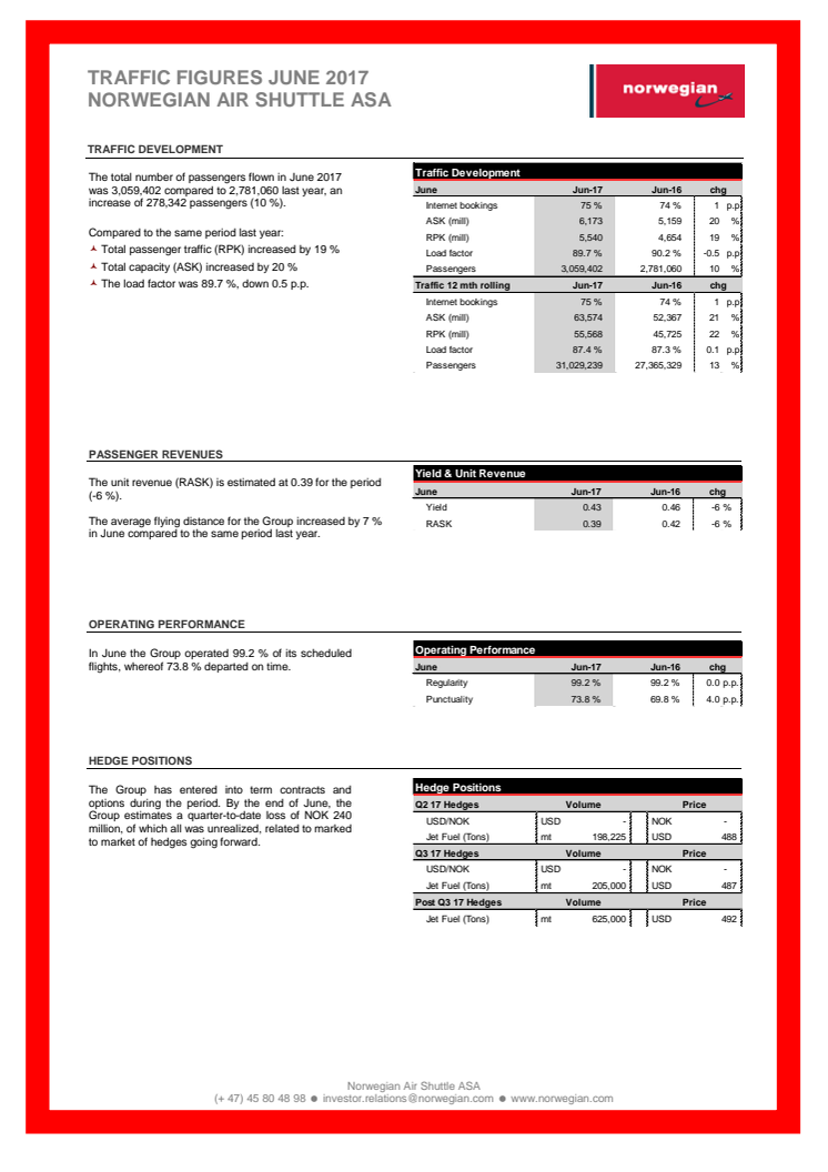 Norwegian Air Shuttle ASA - estadísticas de tráfico de junio de 2017.