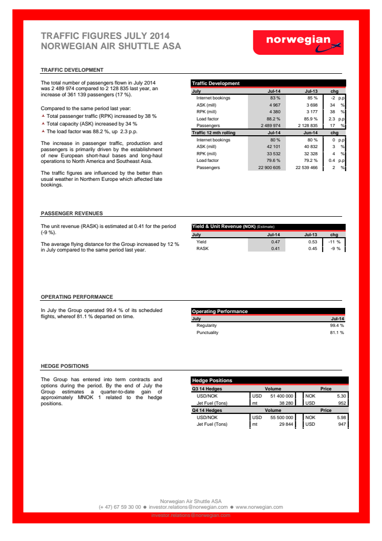 Norwegian transportó cerca de 2,5 millones de pasajeros en julio de 2014, un incremento del 17% comparado con el mismo periodo del año anterior. Se trata del mayor número de pasajeros que Norwegian ha logrado transportar en un solo mes. El coeficiente de ocupación fue del 88,2%.