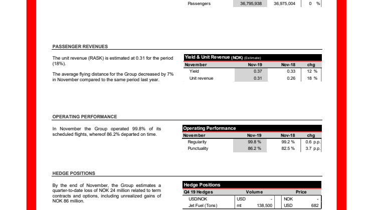 Un total de 2.283.821 pasajeros optaron por volar con Norwegian en noviembre. La compañía operó el 99,8 por ciento de los vuelos programados para ese mes, de los cuales el 86.2 por ciento partió puntual, un aumento de 3.7 puntos porcentuales.