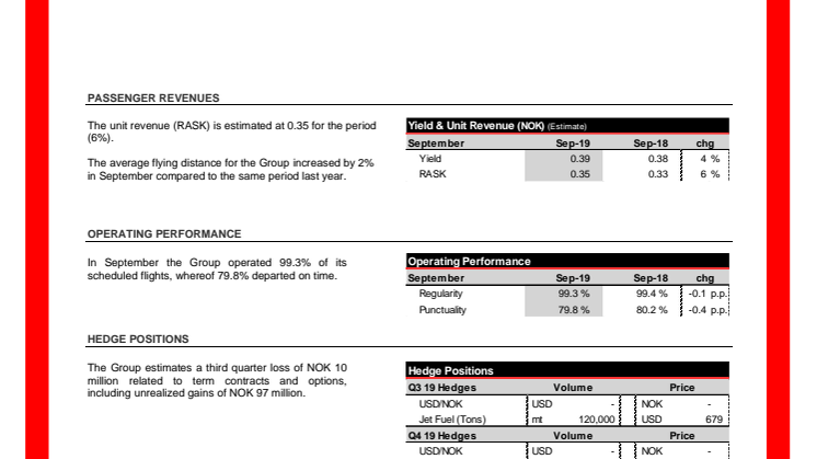 Un total de 3.310.424 pasajeros optó por volar con Norwegian en septiembre. En términos unitarios, el tráfico total (medido éste en PKT, véase glosario al pie de esta nota) aumentó en un 2 por ciento, mientras que la capacidad ofertada (medida ésta en AKO) lo hacía en un 1 por ciento. La ocupación media aumentó en 1,1 puntos porcentuales y llegó al 90 por ciento.