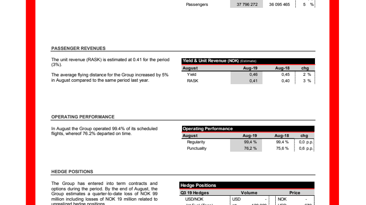 Norwegian transportó más de 3,5 millones de pasajeros en agosto. El ingreso unitario aumentó en un 3 por ciento y la ocupación media fue del 90 por ciento, un aumento de 0,4 puntos porcentuales.