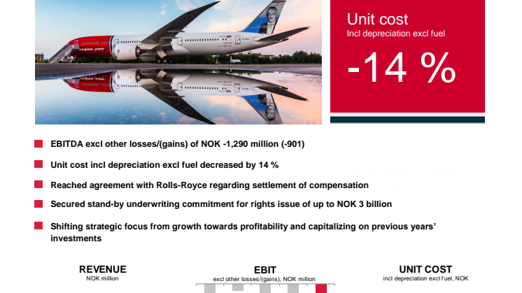 Durante 2018, la compañía se vio afectada por varios desafíos imprevistos. La incesante y dura competencia y los altos precios del combustible de avión afectaron los resultados, además de los costes significativos relacionados con los problemas en los motores Rolls Royce de los Dreamliners. Norwegian se vio obligada a arrendar aviones con tripulaciones para evitar retrasos y cancelaciones en vuelos intercontinentales. Norwegian ha llegado a un acuerdo con el fabricante de los motores, que tendrá un efecto positivo en 2019. La operación del Dreamliner funciona ahora sin contratiempos, y no prevemos que los problemas en los motores vayan a afectar a nuestro servicio en el futuro. A partir de 2019, el crecimiento y las inversiones de Norwegian disminuirán considerablemente, y se ha emprendido una serie de iniciativas para volver a la rentabilidad durante este año.