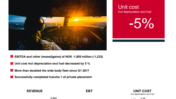 La estrategia de crecimiento global de Norwegian proporcionará economías de escala y menores costes unitarios. Durante el primer trimestre, el coste unitario (incluyendo depreciación y excluyendo el combustible) se rebajó en un 5 por ciento.