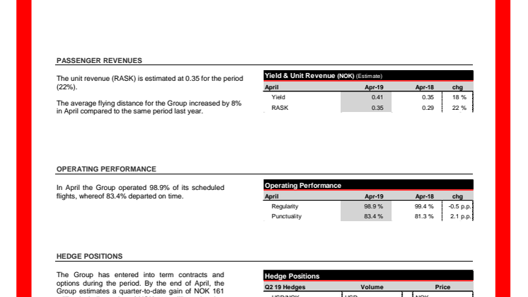 Norwegian operó el 98,9 por ciento de los vuelos programados para el mes de abril. A pesar de que el Boeing MAX fuera retirado de la operación, el impacto en los pasajeros fue limitado: la compañía combinó vuelos y ofreció a los pasajeros opciones alternativas. En abril, el 83,4 por ciento de los vuelos de Norwegian partió puntual, una mejora de 2,1 puntos porcentuales.